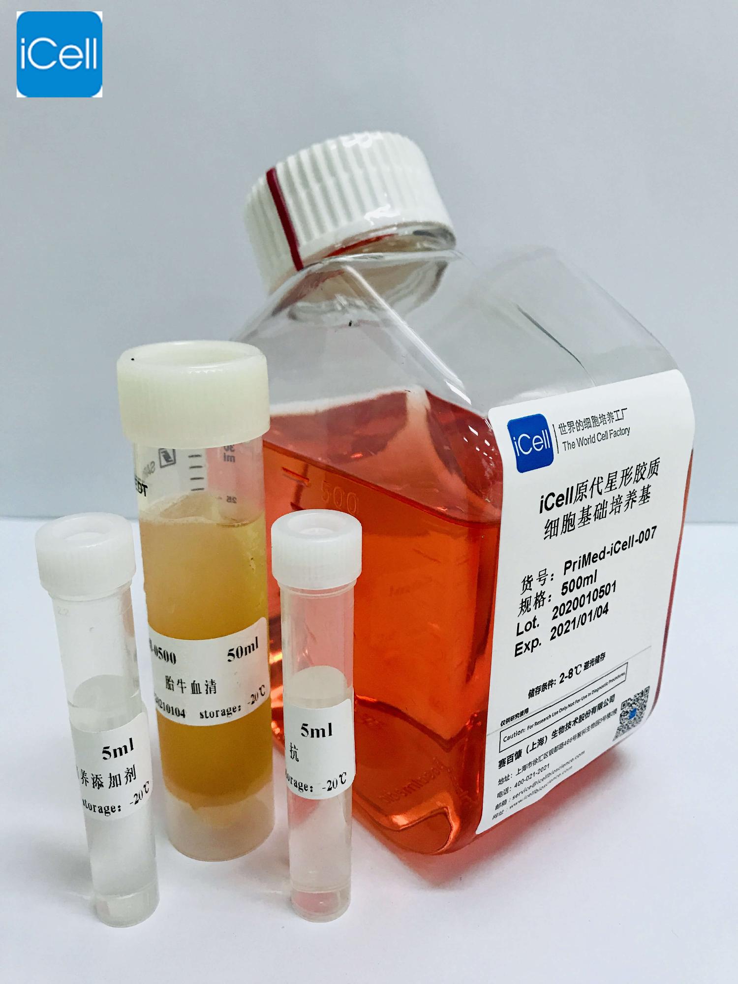 iCell原代星形膠質(zhì)細胞培養(yǎng)體系是一個為體外生長的人、大鼠、小鼠、兔等哺乳動物的星形膠質(zhì)細胞設(shè)計的理想的完全培養(yǎng)基方案。本體系是一個基于碳酸氫鹽的緩沖體系,可以在孵育的5%的CO2的氣體環(huán)境下維持一個圍繞pH7.2的酸堿緩沖體系。本體系是一個無菌的液體混合系統(tǒng),其中包含必須和非必須氨基酸、維生素、激素、生長因子、微量元素和一些其他的有機和無機化合物以及胎牛血清(10%)。本培養(yǎng)體系是基于固定配方配制的液態(tài)培養(yǎng)體系,可以為體外培養(yǎng)的人、大鼠、小鼠、兔等哺乳動物的星形膠質(zhì)細胞提供一個確定適宜的平衡營養(yǎng)環(huán)境,并且可以選擇性的促進星形膠質(zhì)細胞的擴增。